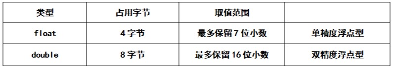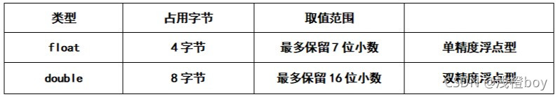 浮点型是用来存储小数,浮点型共分为两个类型1是单精度浮点型,2是双精度浮点型,具体取值范围如下图。