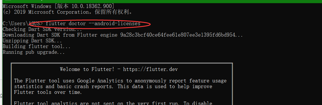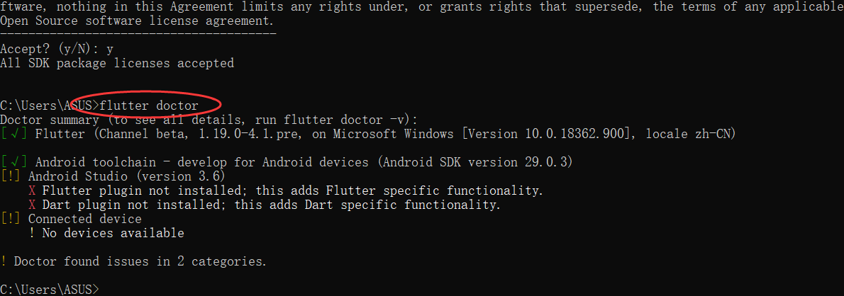 重启后继续执行 flutter doctor 如果还不成功就再执行 flutter doctor --android-licenses ,接下来 所有的输入 y 就可以了