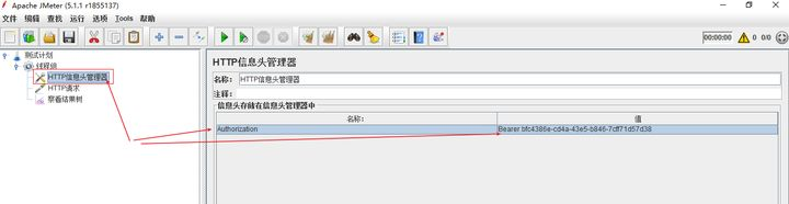 6 在jmeter的信息头当中添加Authorization属性,并设置属性值为Bearer 令牌