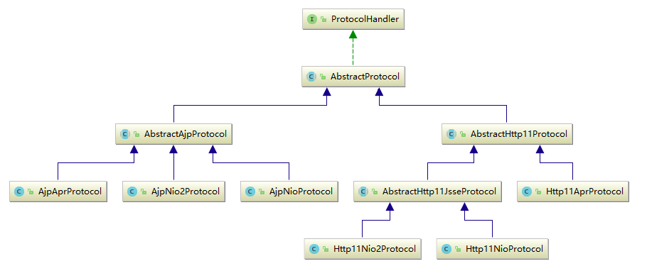 从上面的结构图中可以看出,在Connector中使用ProtocolHandler来处理请求,其主要包含3个组件,分别为Endpoint、Processor、Adapter等。我们来看下ProtocolHandler的接口及其子类的类图: