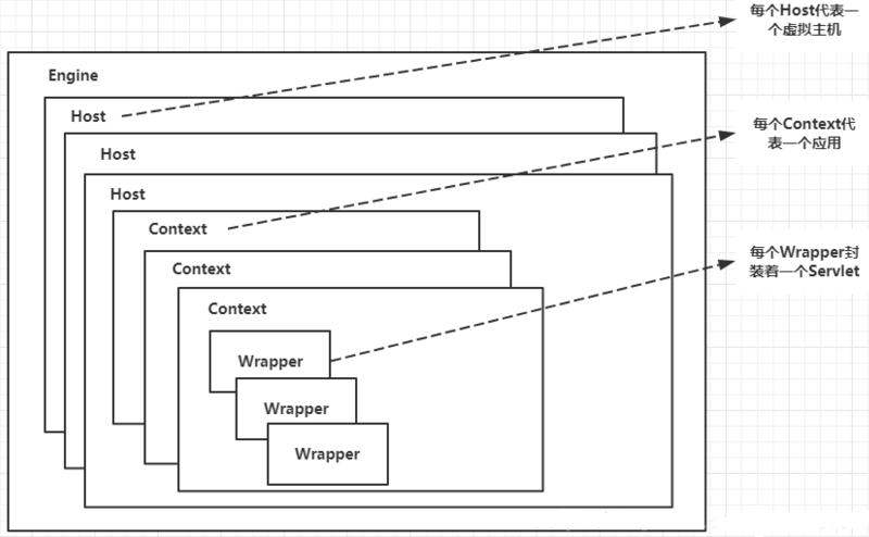 Tomcat 设计了 4 种容器,分别是 Engine、Host、Context 和 Wrapper,其属于父子关系。具体可以参考上文提及的Tomcat中conf/web.xml。其具体的关系可以参考下图(来源:百度):