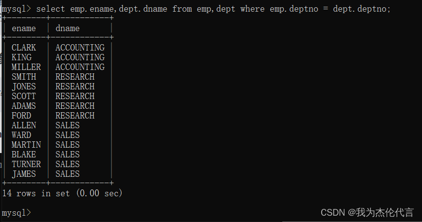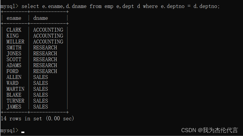 select e.ename,d.dname from emp e,dept d where e.deptno = d.deptno; //SQL92语法。