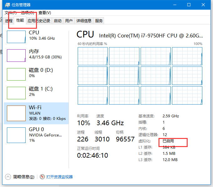 2、开机,检查前面的设置是否已经生效:开机,桌面左下角搜索框,搜索“任务管理器”,打开,选择“性能”,检查是否已启用虚拟化。