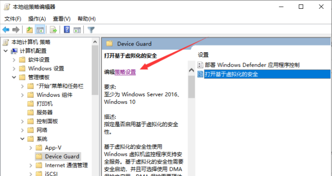 win+r输入gpedit.msc,在计算机配置>管理模版>系统>Device Guard点击打开基于虚拟化的安全点击策略设置,选择已禁用然后应用后确定