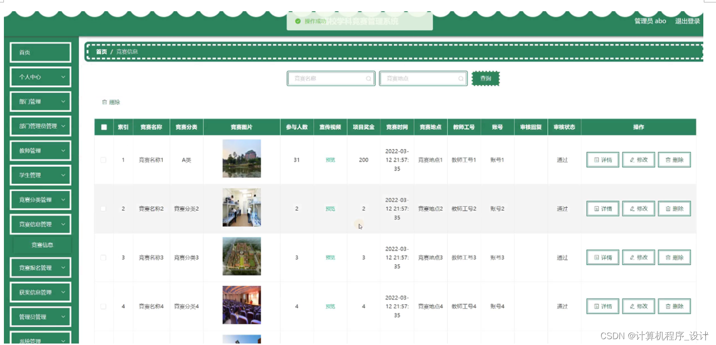 竞赛信息管理:在竞赛信息管理页面,可以查看竞赛名称、竞赛分类、竞赛图片、参与人数、宣传视频、项目奖金、竞赛时间、竞赛地点、教师工号、账号、审核回复、审核状态等内容,进行详情、修改、删除等操作,如图5-6所示:
