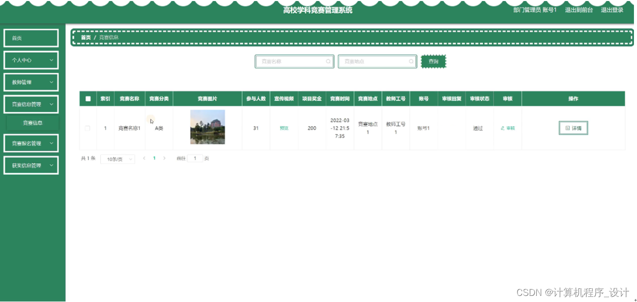 竞赛信息管理,在竞赛信息管理页面可以查看竞赛名称、竞赛分类、竞赛图片、参与人数、宣传视频、项目奖金、竞赛时间、竞赛地点、教师工号、账号、审核回复、审核状态等信息进行审核、详情等操作,如图5-21所示。