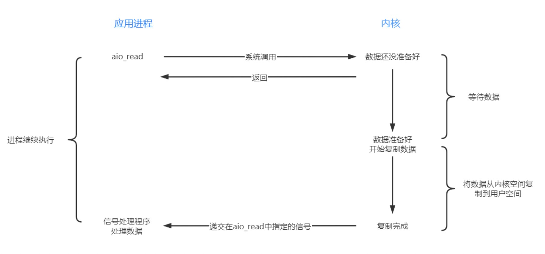 相比于同步IO,异步IO不是顺序执行的。应用进程在执行aio_read系统调用之后,无论数据是否准备好,都会直接返回给用户进程,然后应用进程可以去做别的事情。当数据准备好之后,内核直接复制数据给用户进程,然后内核向进程发送通知。过程如下: