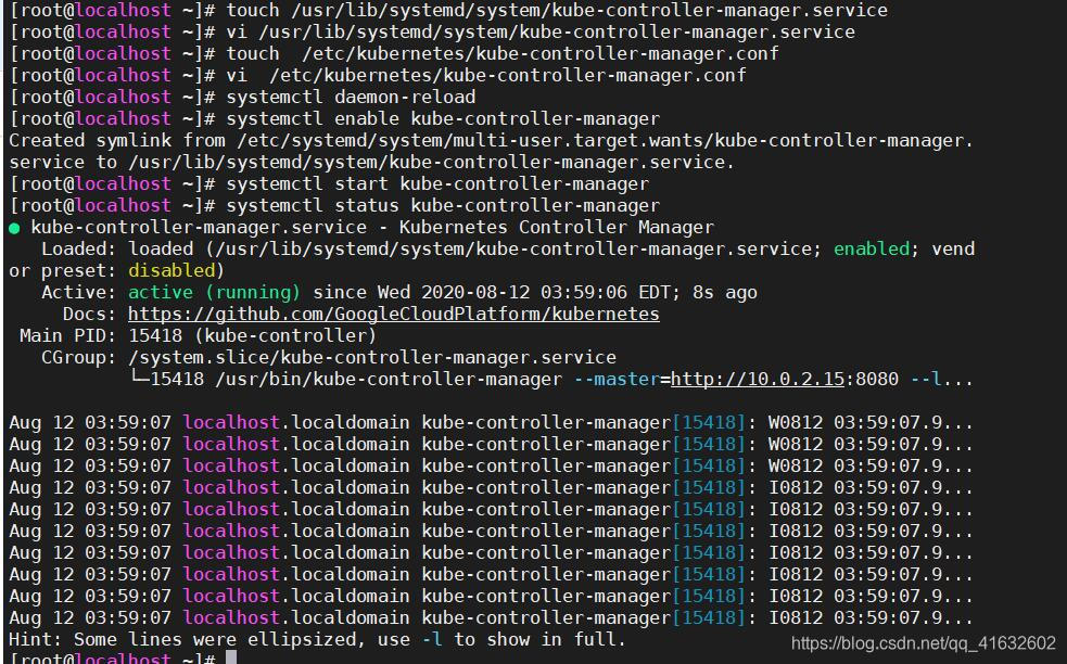 KUBE_CONTROLLER_MANAGER_ARGS="--master=http://10.0.2.15:8080 --logtostderr=true --log-dir=/var/log/kubernetes --v=2"启动kube-controller-manager