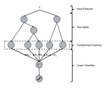 输入特征通过增强的决策树进行转换。每个单独树的输出被视为稀疏线性分类器的分类输入特征。增强的决策树被证明是非常强大的特征转换。以下图为例,