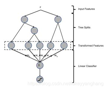对于输入x,假设他落在左子树第一个节点,编码[1,0,0],落在右树第二个节点则编码为[0,1],所以整体编码为[1,0,0,0,1],这类编码作为特征,输入到线性分类模型(LR or FM)中进行分类。
