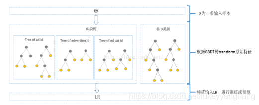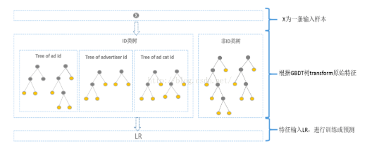 当一条样本x进来之后,遍历两类树到叶子节点,得到的特征作为LR的输入。当AD曝光不充分不足以训练树时,其它树恰好作为补充。