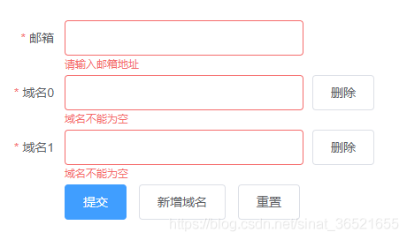 发现我的方法与官方文档的区别在于,官方文档的示例是通过v-for循环的方式渲染出来的表单,当数组domains变化时会触发表单的重新渲染(起初并未意识到这一点),所以能够有效的动态验证表单,而我的方法只是动态修改了props属性,而并未出发表单的重新渲染,验证器中的prop属性并未更新,还是初次渲染时的空值,知道原因就想到了解决办法。