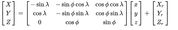 上面给的转换到ECEF坐标的旋转矩阵则是ENU到ECEF的旋转矩阵。下面会给出ENU到ECEF的旋转矩阵。
