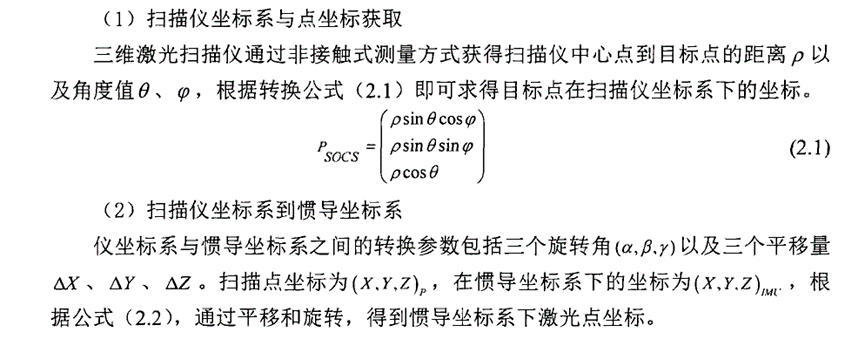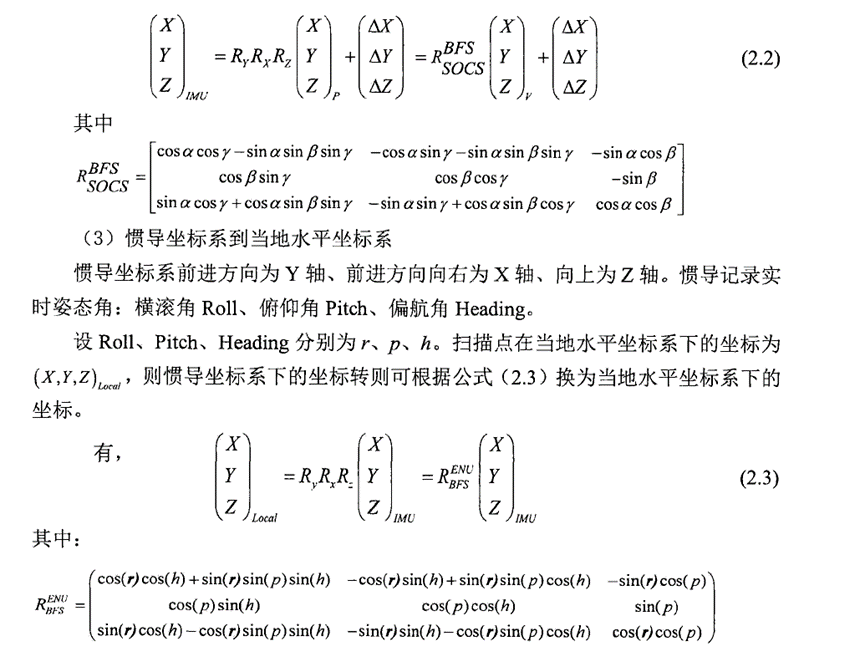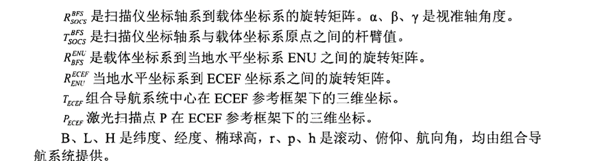 一般点云生成过程所涉及到的坐标系统主要包括激光扫描仪坐标系、惯导坐标系、当地水平坐标系、地心地固坐标系。坐标系的变换如下所示:
