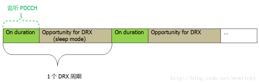 UE在连接态下,如果没有数据传输的话,会根据DRX的规则停止监听PDCCH(监听PDCCH可参考:PDCCH),从而达到省电的目的。一个DRX周期包含On Duration 和Opportunity for DRX 两个时间段。