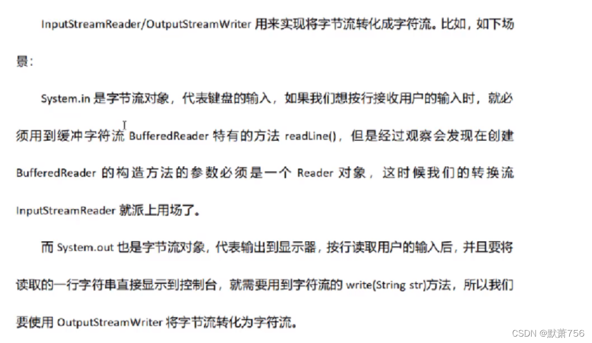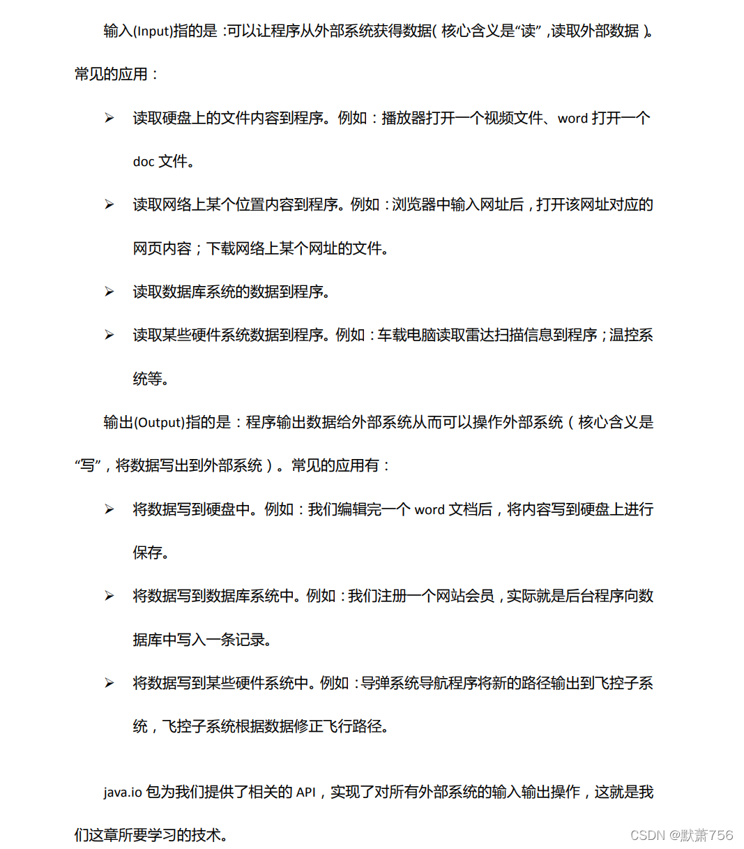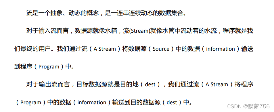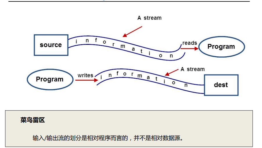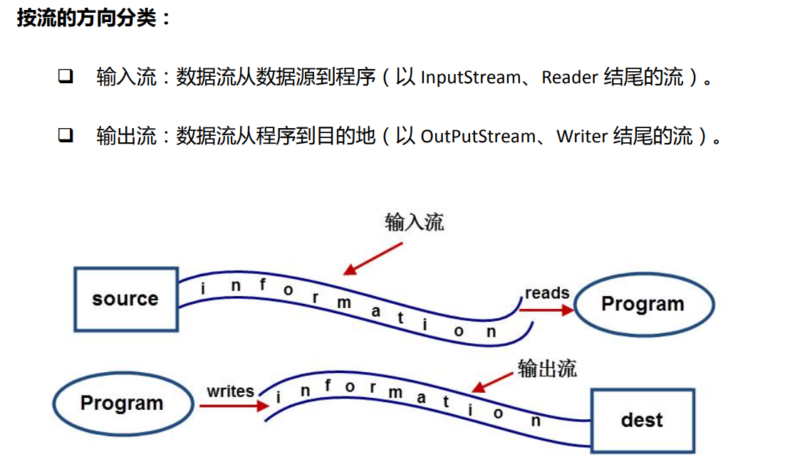 输出流:程序到目的地(OutPutStream、Writer写出去)。