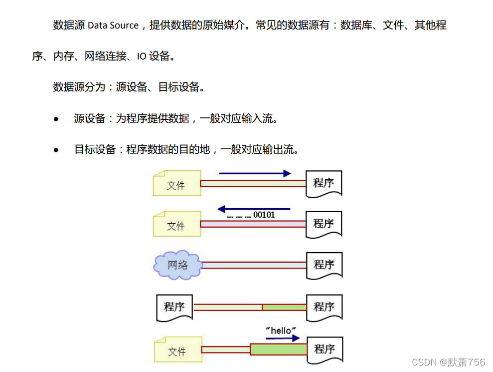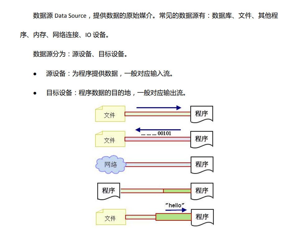 输入流:数据源到程序(InputStream、Reader读进来)。