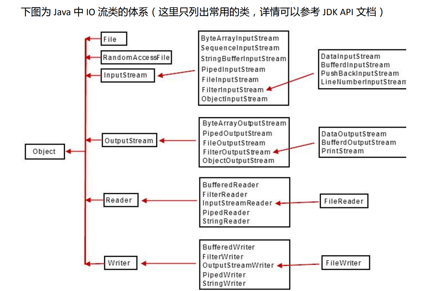从上图发现,很多流都是成对出现的,比如:FileInputStream/FileOutputStream,显然是对文件做输入和输出操作的。下面简单做个总结: