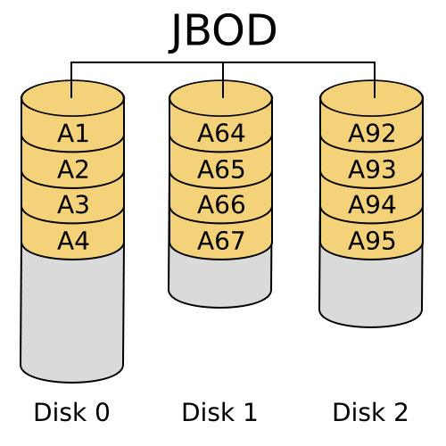 JBOD ( Just a Bunch Of Disks )不是标准的 RAID 等级,它通常用来表示一个没有控制软件提供协调控制的磁盘集合。 JBOD 将多个物理磁盘串联起来,提供一个巨大的逻辑磁盘。 JBOD 的数据存放机制是由第一块磁盘开始按顺序往后存储,当前磁盘存储空间用完后,再依次往后面的磁盘存储数据。 JBOD 存储性能完全等同于单块磁盘,而且也不提供数据安全保护。它只是简单提供一种扩展存储空间的机制, JBOD 可用存储容量等于所有成员磁盘的存储空间之和。目前 JBOD 常指磁盘柜,而不论其是否提供 RAID 功能。