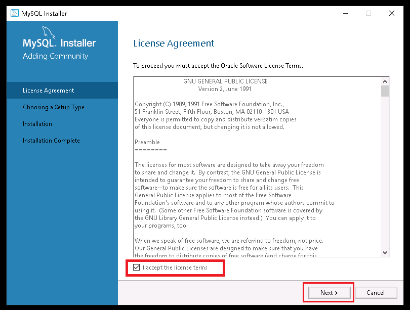 2、勾选I accept the license terms,然后点击Next