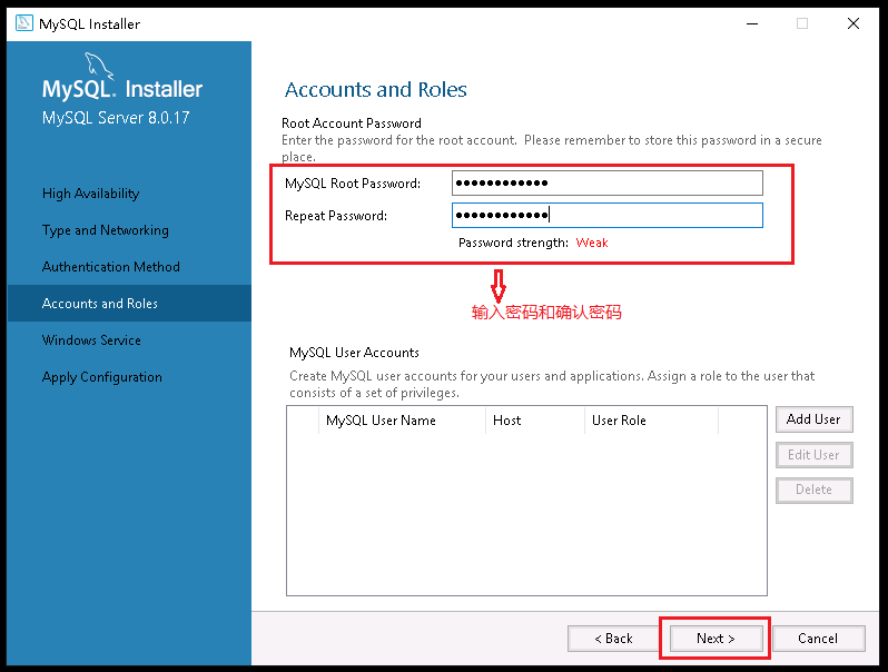 13、在MySQL Root Password:输入框中输入数据库系统Root用户的密码