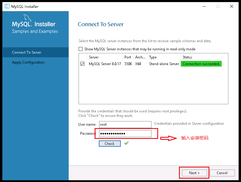 20、在Password输入数据库Root用户的密码(参见前面第13步设置的ROOT用户的密码),点击Check,如果显示绿色的Connection succeeded,则表示安装连接成功。最后点击Next