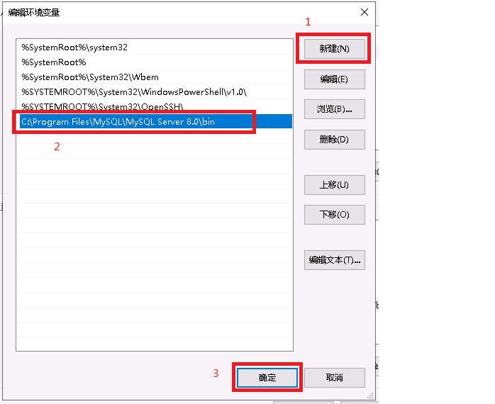 4、点击新建,在左边的输入框的尾部输入 C:\Program Files\MySQL\MySQL Server 8.0\bin,最后点击确定