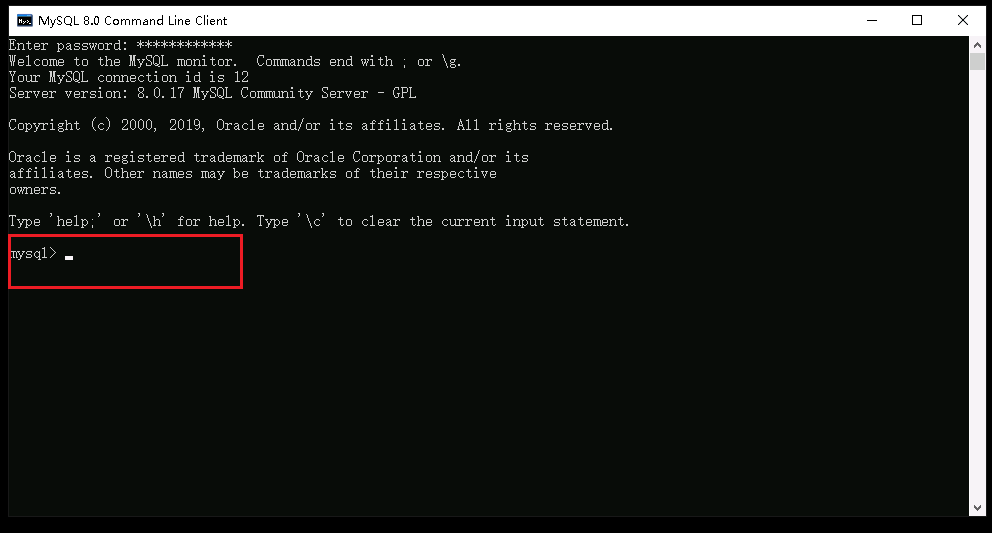 3、如果出现下面界面,说明登录MySQL数据库成功,下面就可以在 mysql> 后面输入SQL命令。