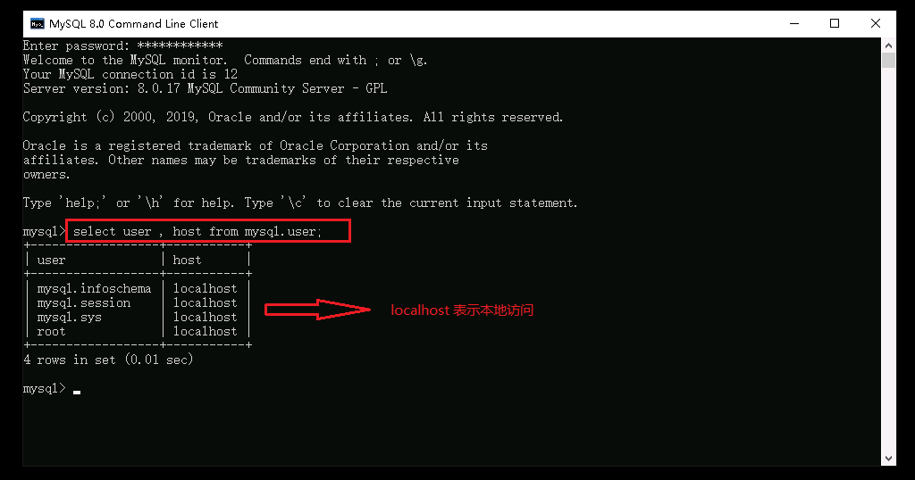 输入 select user , host from mysql.user; 查看MySQL数据库所有用户的权限。