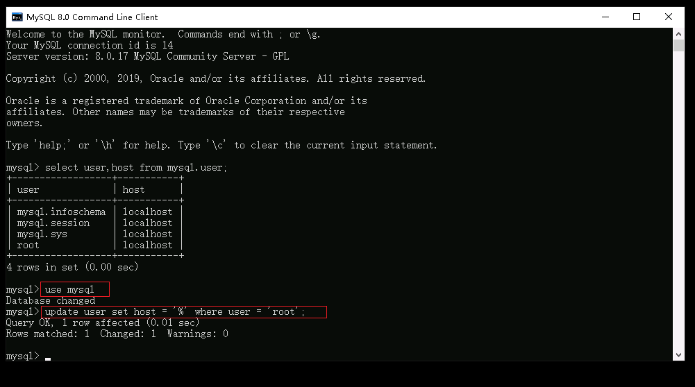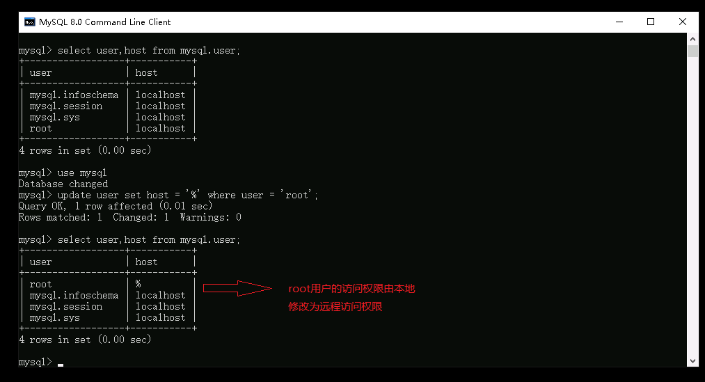 从下图观察到ROOT用户的权限被修改为%,而%就表示ROOT既支持本地访问又支持远程访问,说明修改ROOT远程访问权限成功。