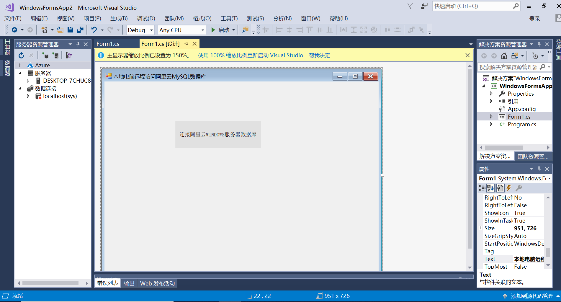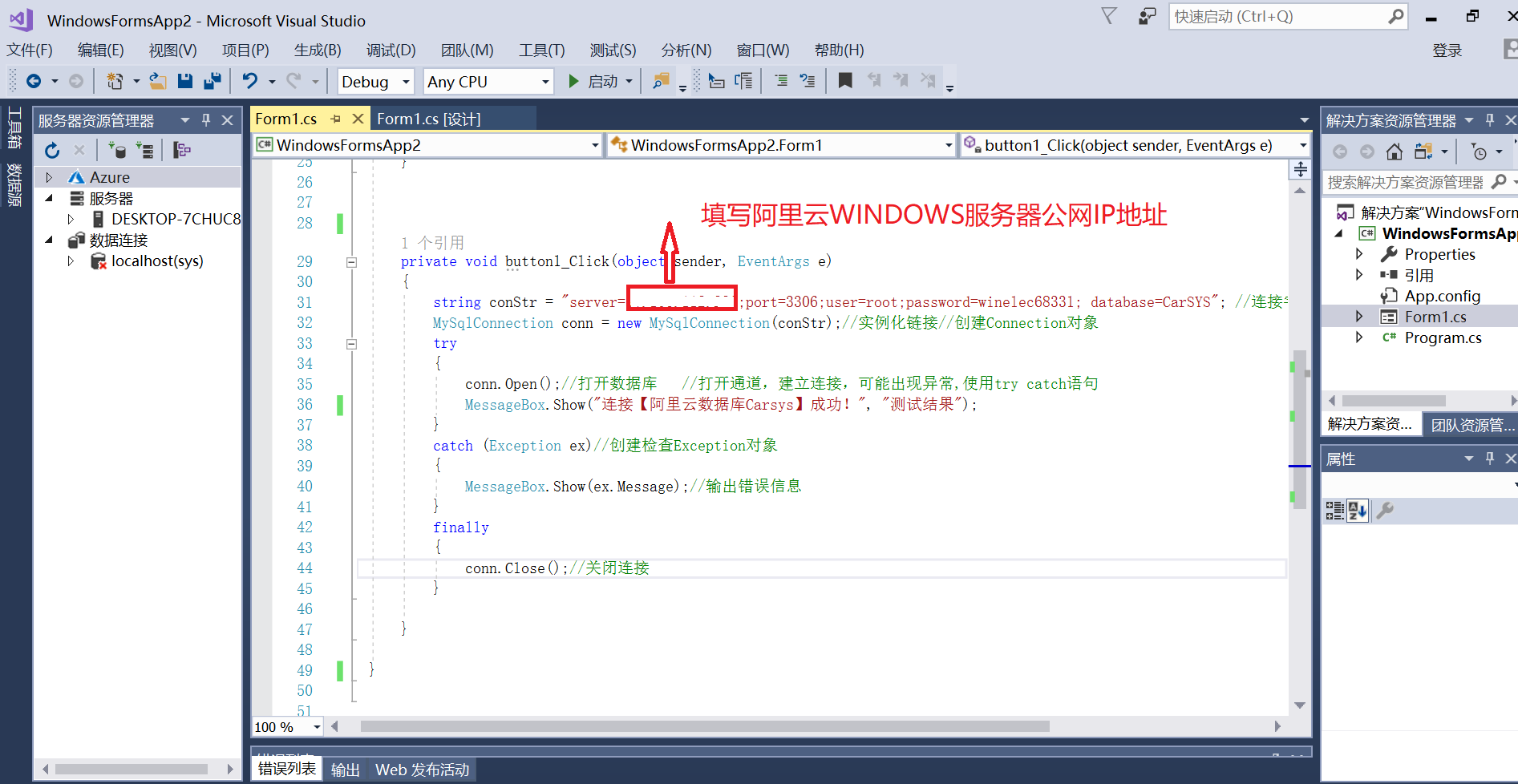 八、本地电脑用Visual Studio 2017编写C#程序远程测试连接阿里云WINDOWS SERVER 2019服务器上创建的用户数据库