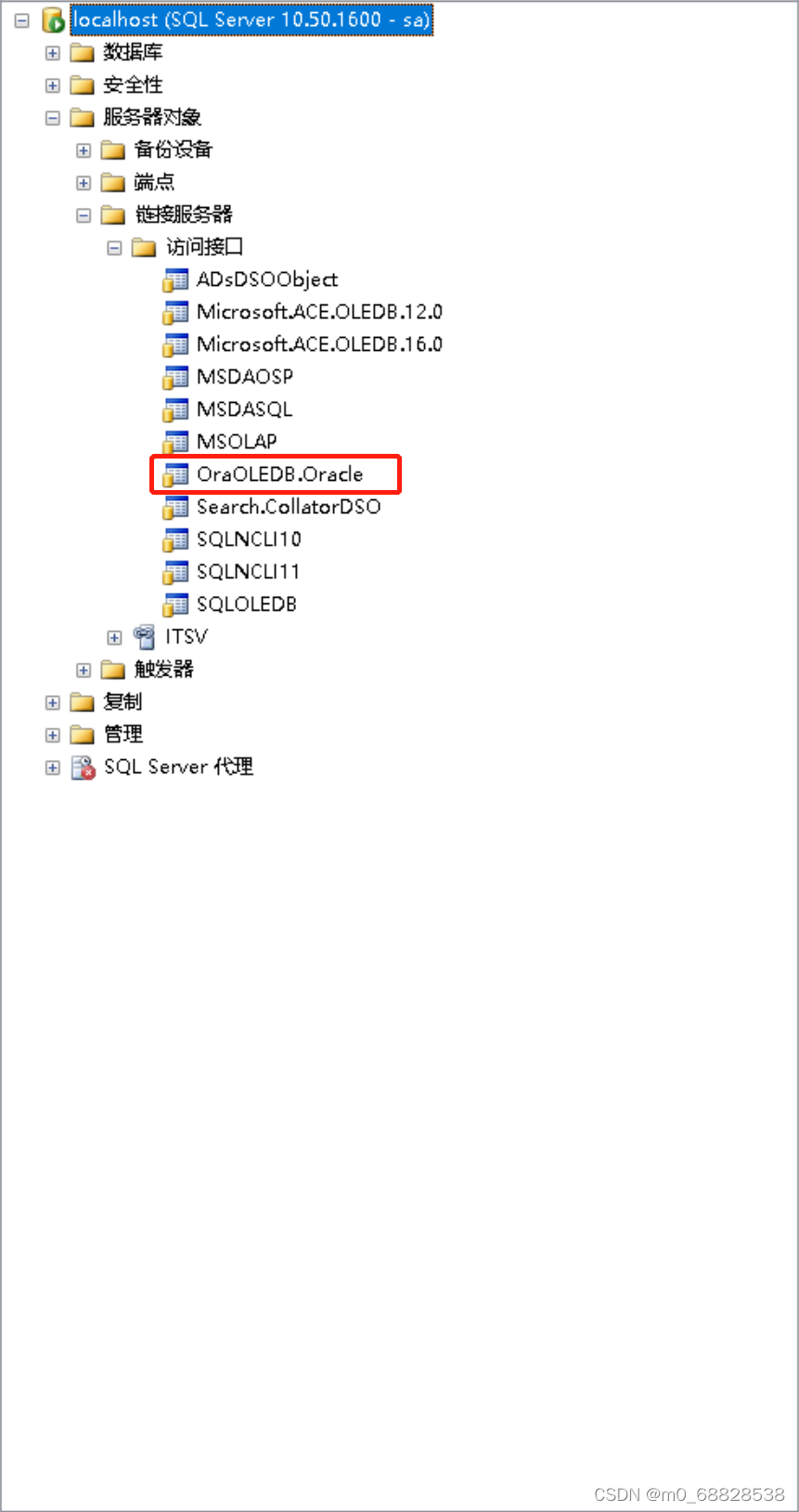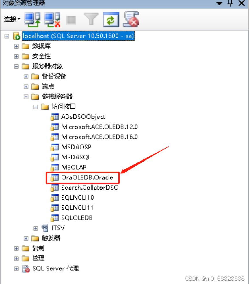 步骤一:检查SQL Server数据库链接服务器中,是否有OraOLEDB.Oracle访问接口。如有此访问接口,直接进行步骤五