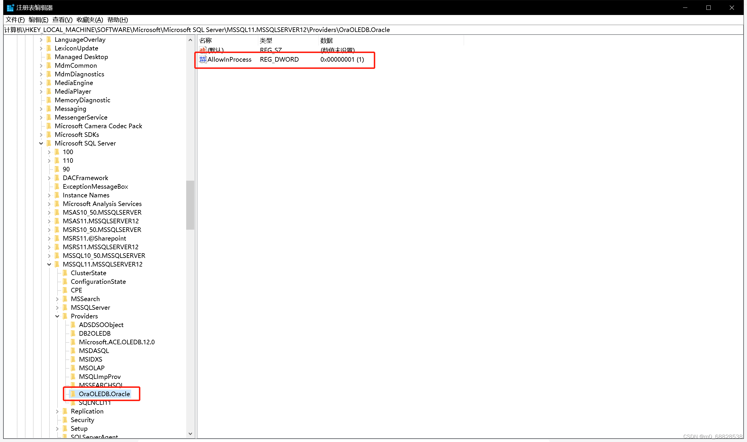 为“OraOLEDB.Oracle”这个键新增一个DWORD 32位,把名字改为“AllowInProcess”