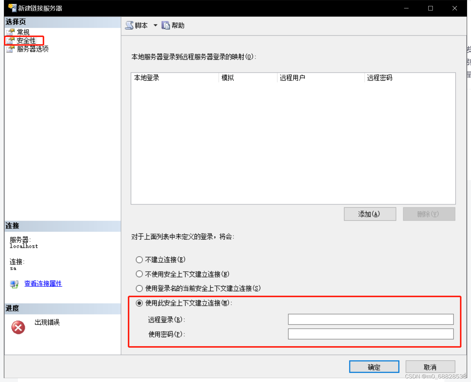 点击安全性,选择使用此安全上下文建立连接,填写远程登录用户名和密码。