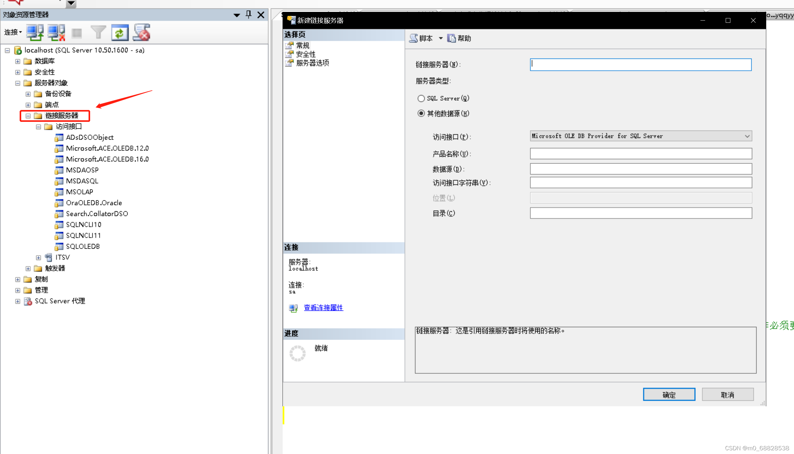 步骤五:右键链接服务器,新建链接服务器。