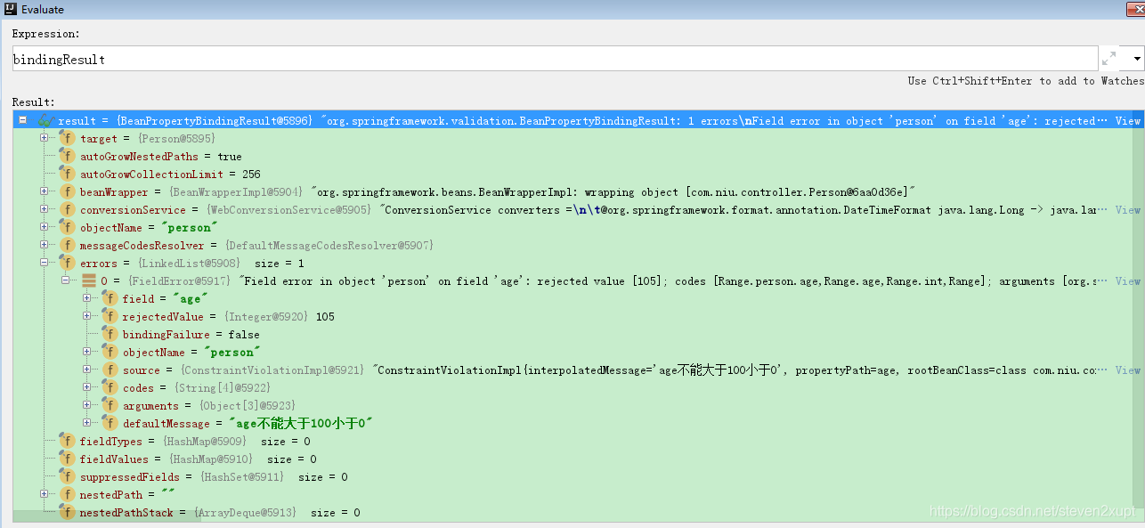 Field error in object 'person' on field 'age': rejected value [105]; codes [Range.person.age,Range.age,Range.int,Range]; arguments [org.springframework.context.support.DefaultMessageSourceResolvable: codes [person.age,age]; arguments []; default message [age],100,0]; default message [age不能大于100小于0]