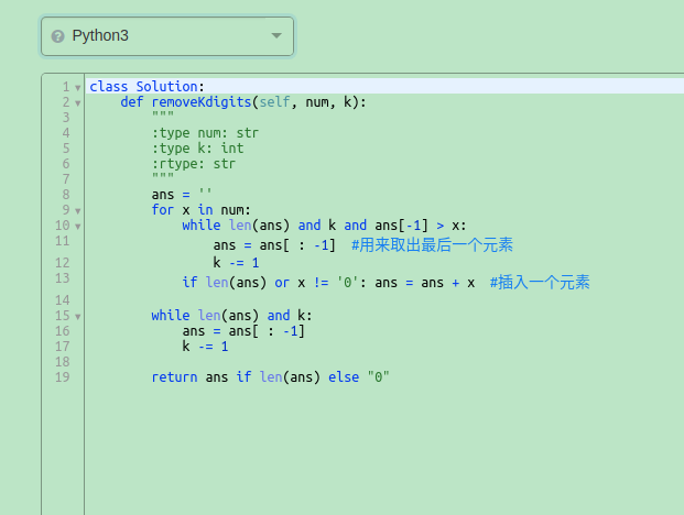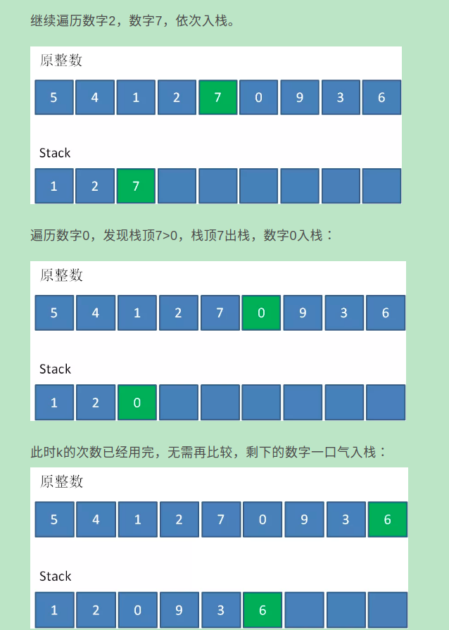 使用一个栈来维护所给数字,充分利用栈的特性。在遍历原数字时,让所有数字一个一个入栈,当某个数字需要删除时,则让他出栈。