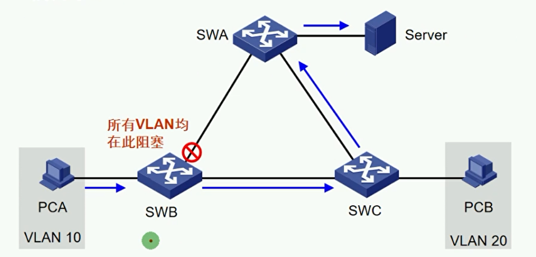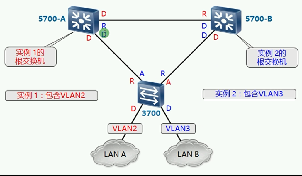 - RSTP在STP基础上进行了改进,实现了网络拓扑快速收敛。但由于 局域网内所有的VLAN共享一棵生成树,因此被阻塞后链路将不存在任何流量,无法在VLAN间实现数据流量的负载均衡,从而造成带宽浪费;