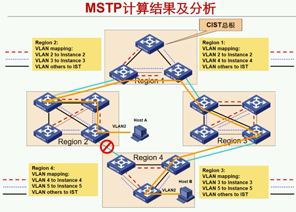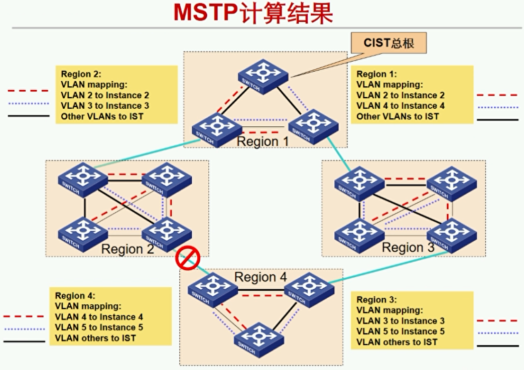 - 区域3根桥再转发到区域1中,此时发现有VLAN 2的实例,就会将数据转发给在区域1中有VLAN2实例的设备