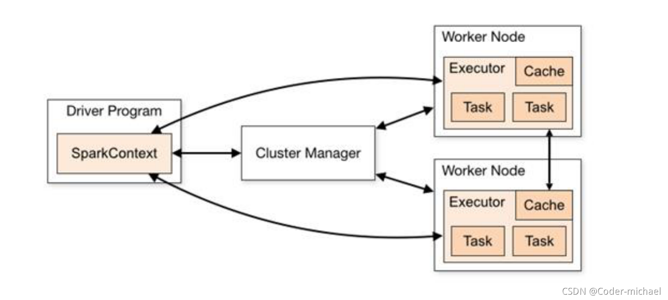 Spark 框架的核心是一个计算引擎,整体来说,它采用了标准 master-slave 的结构。如图所示,它展示了一个 Spark 执行时的基本结构。图形中的 Driver 表示 master,负责管理整个集群中的作业任务调度。图形中的 Executor 则是 slave,负责实际执行任务。