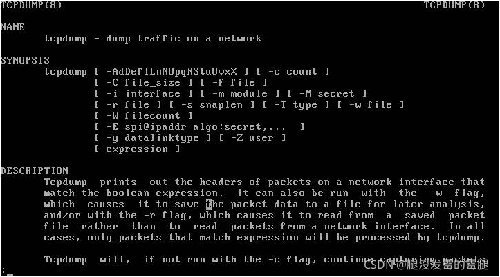 使用命令tcpdump –h命令或者用man tcpdump命令可以获得tcpdump命令的帮助说明。这里我们使用man tcpdump。如图所示: