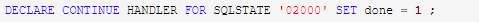DECLARE CONTINUE HANDLER FOR SQLSTATE '02000' SET done = 1 ;