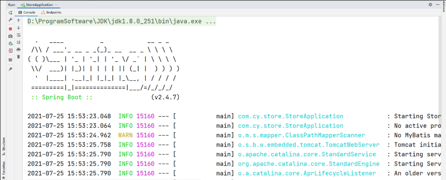 1.找到项目的入口类(被@SpringBootApplication注解修饰),然后运行启动类;启动过程如果控制台输出Spring图形则表示启动成功。