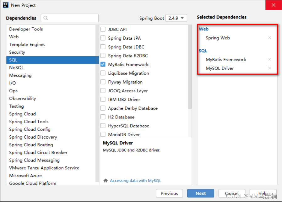 4.给项目添加Spring Web、MyBatis Framework、MySQL Driver的依赖。点击【Next】按钮完成项目创建。