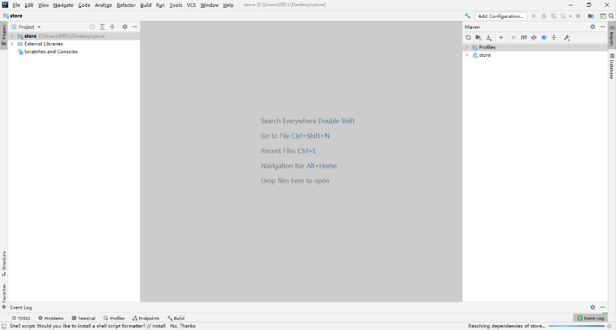 5.首次创建完Spring Initializr项目时,解析项目依赖需消耗一定时间(Resolving dependencies of store...)。