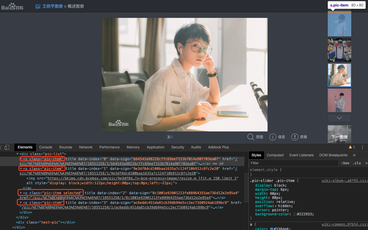 这里的'pic-item selected'只有在人为访问的时候才会出现,表示当前展示给你的图片,而用requests获取的网页中不会有这个关键词,所以确保能够将所有图片都能爬取到。