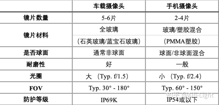表1总结了车载摄像头和手机摄像头在镜头方面的主要参数差异。