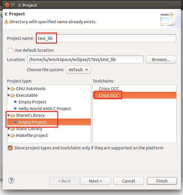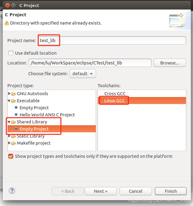 2.设置如下项目名称为test_lib,创建动态库所以选择Shared Library, 为了方便测试编译工具Toolchains我们选择x86架构,点击Next.