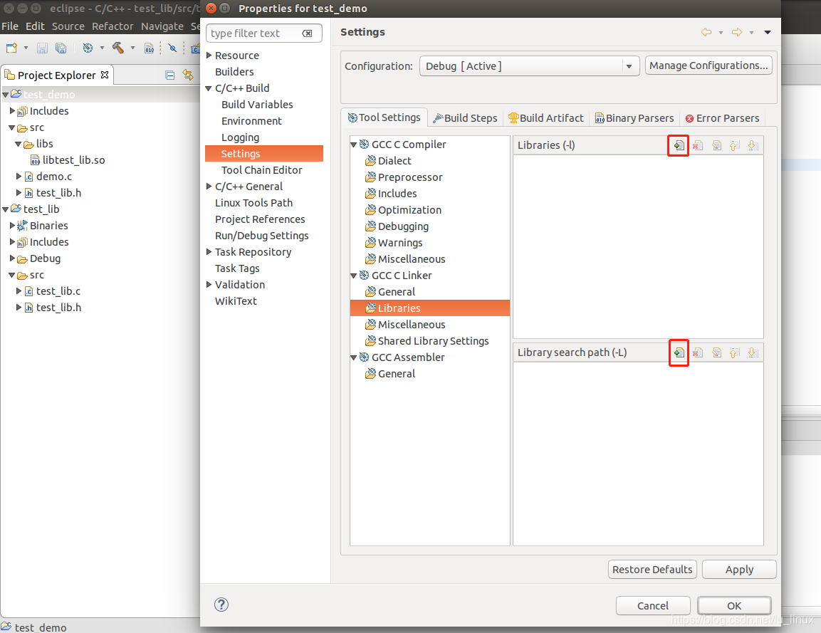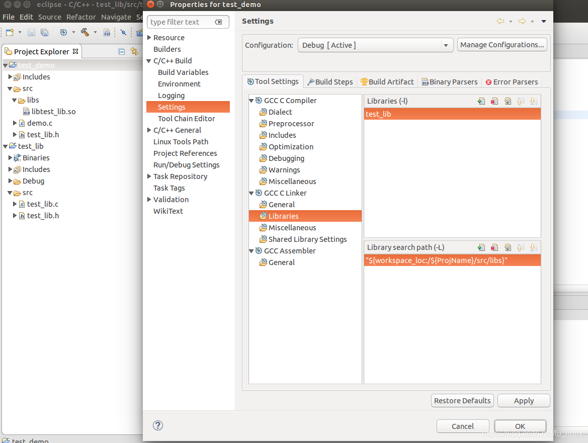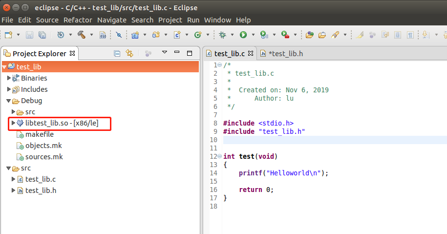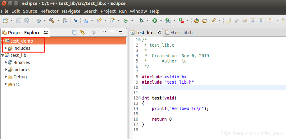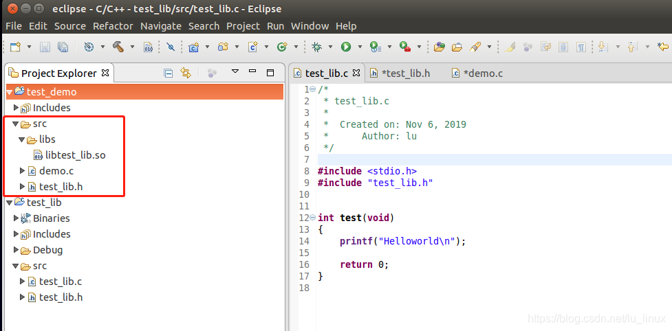 4.创建src目录,将动态库的头文件test_lib.h复制到test_demo的src目录下,在src目录下创建一个libs目录,将生成的libtest_lib.so复制到libs,新建源文件demo.c内容如下: