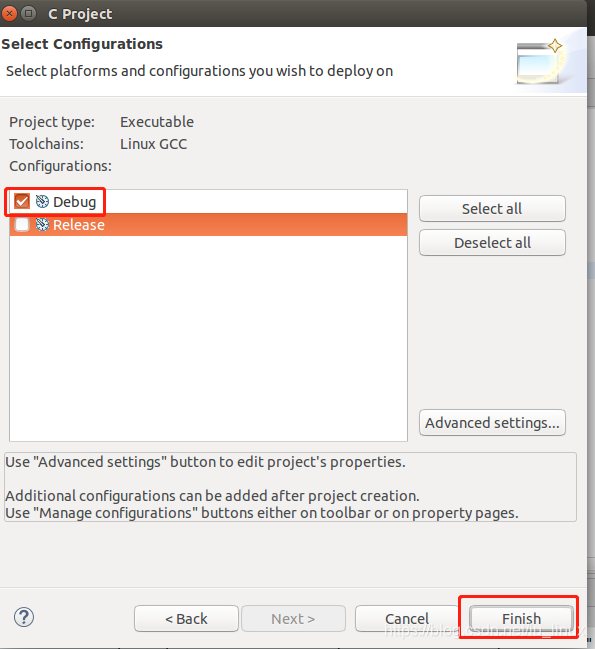 3.进入设置界面选择配置,选择Debug, 点击Advanced Settings会弹出右边窗口,可以进行参数配置,这里我们选择默认配置,直接点击Finish